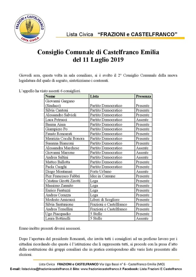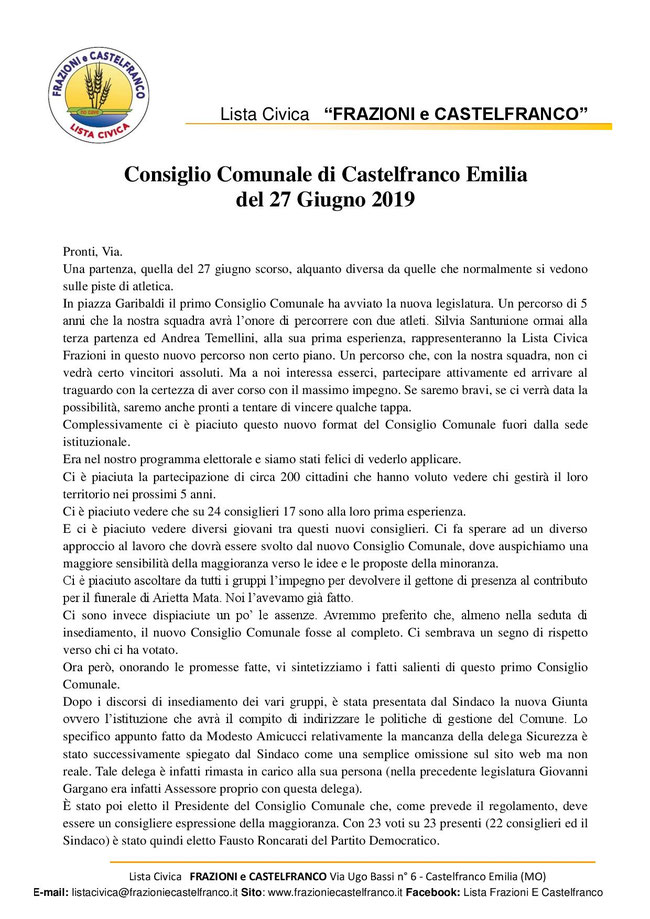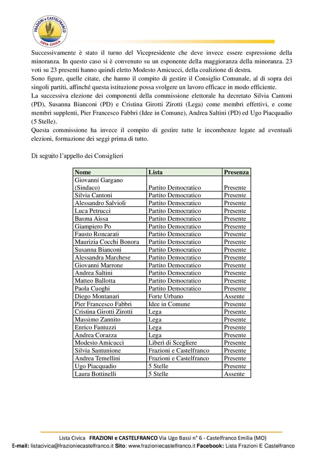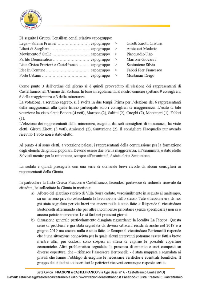 Civica Frazioni e Castelfranco ha concluso questi 10 anni in Consiglio con responsabilità, serietà, coerenza e rispetto del mandato conferitoci dagli elettori, fieri di aver raggiunto un livello