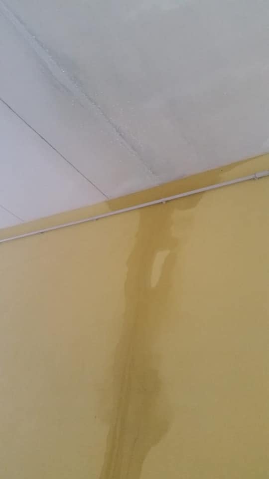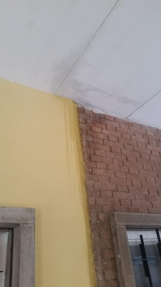 chiesetta oggetto di intervento, il pavimento è tutto bagnato, alzando gli occhi si vedono le infiltrazioni dal tetto sia sulla parete della chiesa sia sull’altra. La stessa cosa, anche se un po’