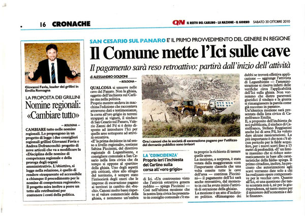 La questione della tassazione ICI delle cave è stata posta per la prima volta dalla nostra Lista Civica con una domanda fatta ad un Consiglio Comunale del 9 giugno scorso, domanda alla quale l’Amministrazione non ha saputo dare risposta. A questa nostra prima interrogazione è seguita, sempre a giugno, una interrogazione scritta e il 7 ottobre una mozione con la quale, così come è stato fatto successivamente a San Cesario , abbiamo chiesto l’introduzione del pagamento dell’ICI per le aree di cava. Noi, a differenza di San Cesario, siamo ancora in attesa di risposte perché a Castelfranco Emilia i tempi per trattare delle nostre interrogazioni e mozioni sono sempre troppo lunghi (e quasi sempre superiori ai 30 giorni previsti dalla normativa) e per tale motivo la questione non è ancora stata discussa.