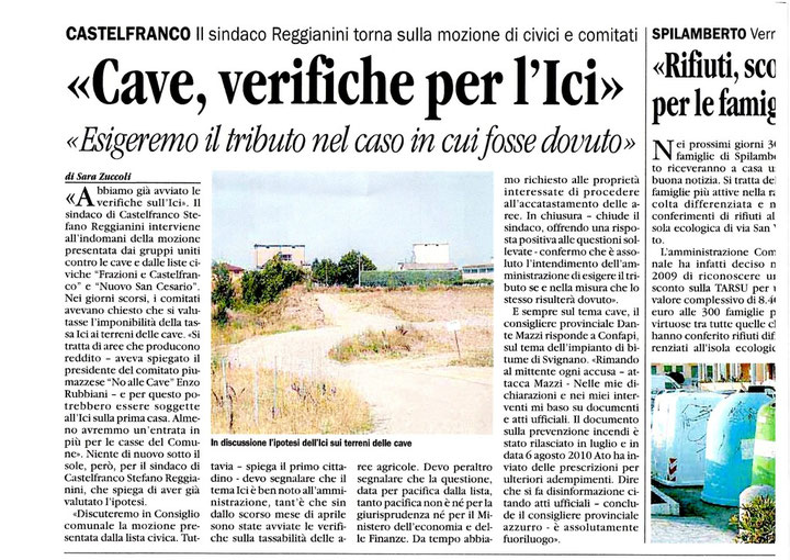 Ci auguriamo che, dopo quanto accaduto a San Cesario, anche la maggioranza PD di Castelfranco Emilia provveda a trattare quanto prima in Consiglio Comunale la questione da noi posta – ormai sei mesi fa - sulla tassazione ICI delle cave. Peraltro, questa avrebbe dovuto essere una questione di cui si sarebbe dovuta occupare la maggioranza che ci amministra fin dal momento dell’introduzione dell’ICI (1993), cosa che invece non è stata fatta e se ne parla solo oggi, dopo le nostre sollecitazioni! E al Sindaco che sulla stampa afferma che trattasi di questione non scontata, noi replichiamo che ne vogliamo discutere in Consiglio Comunale!