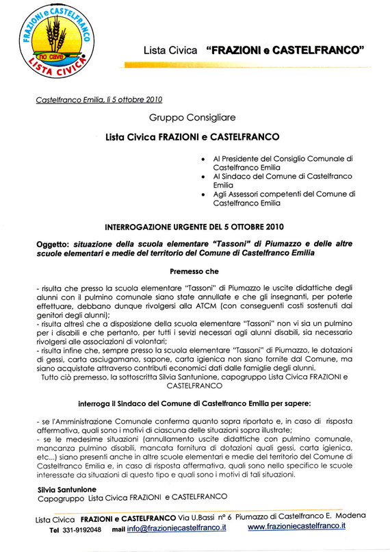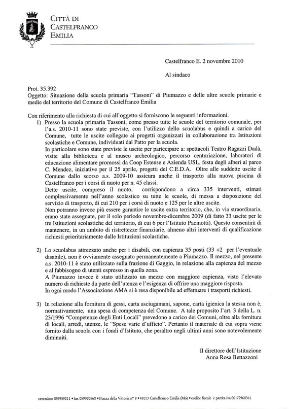 04. gennaio 2011 TRASPORTI E DOTAZIONI ALLA SCUOLA ELEMENTARE DI PIUMAZZO Finalmente l'amministrazione ci da alcune risposte riguardo l'attuale situazione in cui versa la scuola elementare di Piumazzo quanto a trasporti e materiale didattico come da nostra interrogazione del 5 ottobre sotto riportata: tagPlaceholderTag: