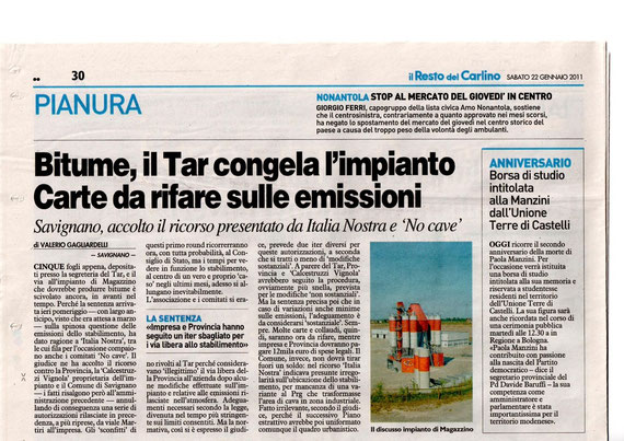 e ai comitati ambientalisti e "no cave" incassa un'importante vittoria al T.A.R. che di fatto BLOCCA L'AVVIO DELL'IMPIANTO DI BITUME sito in località Magazzino.