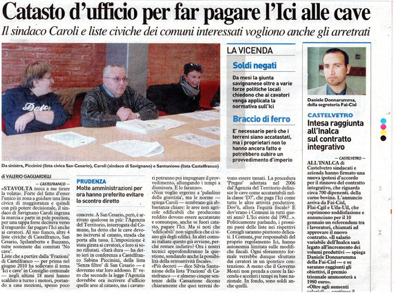 La legge è uguale per tutti, o no? Perciò, se l’ICI (o futura IMU) la pagano i cittadini e le imprese, la devono pagare anche le cave. E’ quanto, in estrema sintesi, hanno spiegato il 5 gennaio 2012 i rappresentanti delle liste civiche e dei comitati di cinque territori feriti a morte dalle escavazioni di ghiaia (Castelfranco, San Cesario, Savignano, Bazzano e Spilamberto) in una conferenza stampa congiunta, perché di azione congiunta si tratta: Silvia Santunione, capogruppo della lista civica Frazioni e Castelfranco, Leda Diano per la lista Civicamente Bazzano, Germano Caroli, sindaco di Savignano sul Panaro eletto per la lista dei cittadini Insieme per Savignano, Sabina Piccinini, capogruppo della lista civica Nuovo San Cesario con Senzafiltro e Federico Corsini, consigliere “più anziano” della lista Spilamberto Solidarietà Ambiente, con la partecipazione e il supporto del Coordinamento delle liste di Cittadini di Modena e Bologna.