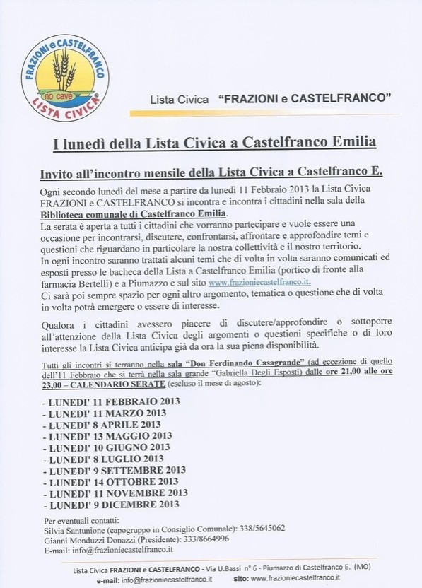 13. maggio 2013 I LUNEDI' DELLA LISTA CIVICA A CASTELFRANCO EMILIA tagPlaceholderTag: Scrivi commento Commenti: 0