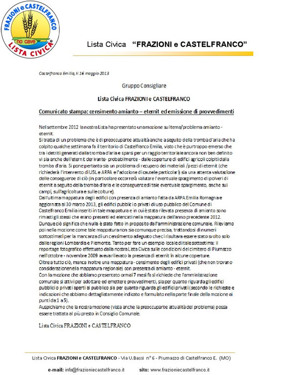 All'indomani dell'ennesima avversa ed estrema condizione atmosferica (leggesi la tromba d'aria verificatasi nella zona di Castelfranco Emilia) si sollecita un censimento dell'amianto....
