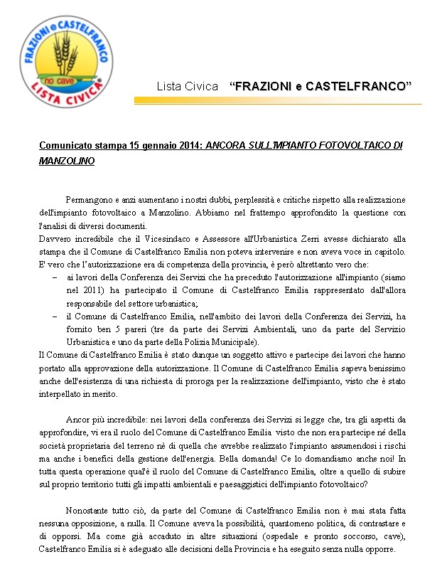 16. gennaio 2014 COMUNICATO STAMPA IMPIANTO FOTOVOLTAICO MANZOLINO tagPlaceholderTag: Scrivi commento Commenti: 0