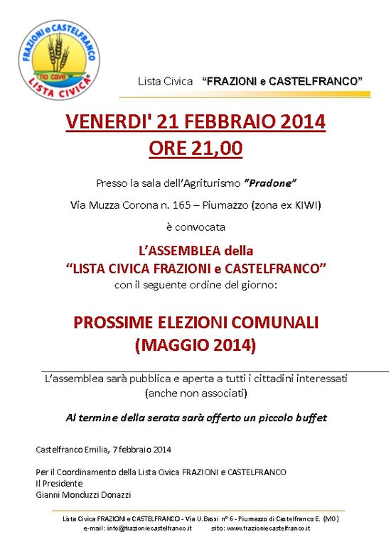 07. febbraio 2014 ASSEMBLEA LISTA CIVICA FRAZIONI E CASTELFRANCO tagPlaceholderTag: Scrivi commento Commenti: 0