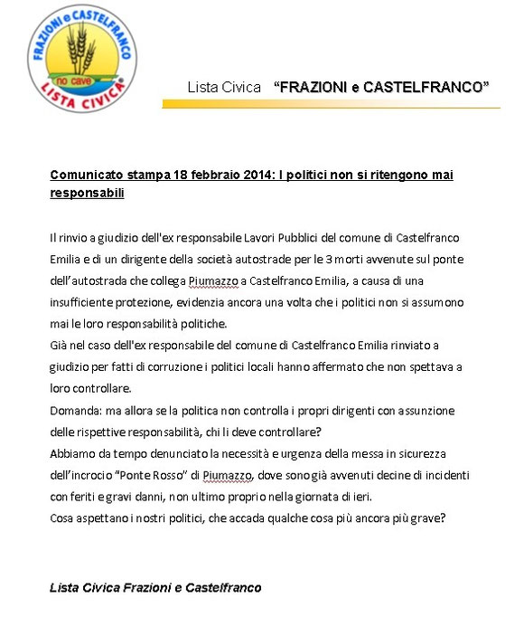 18. febbraio 2014 I POLITICI NON SI RITENGONO MAI RESPONSABILI ! tagPlaceholderTag: Scrivi commento Commenti: 0