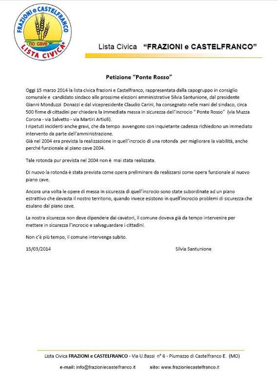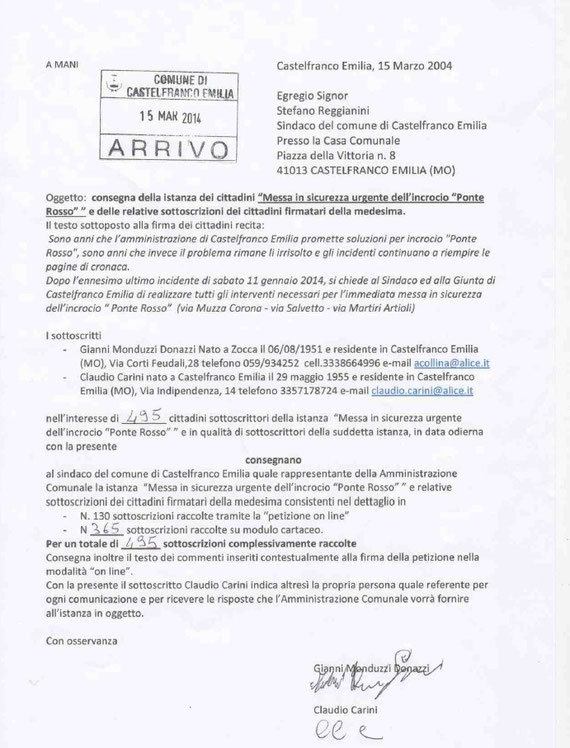 18. marzo 2014 CONSEGNATE 500 FIRME PETIZIONE POPOLARE MESSA IN SICUREZZA INCROCIO PONTE ROSSO tagPlaceholderTag: Scrivi commento Commenti: 0
