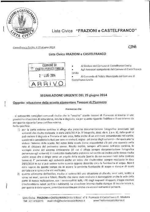 17. luglio 2014 SEGNALAZIONE URGENTE AL SINDACO: SITUAZIONE DELLA SCUOLA ELEMENTARE TASSONI DI PIUMAZZO La scuola Tassoni si trova in una gravissima situazione di abbandono incuria e degrado. Le immagini non hanno bisogno di commenti, questo è lo stato in cui versa un bene pubblico di primaria importanza come una scuola. tagPlaceholderTag: Scrivi commento Commenti: 0