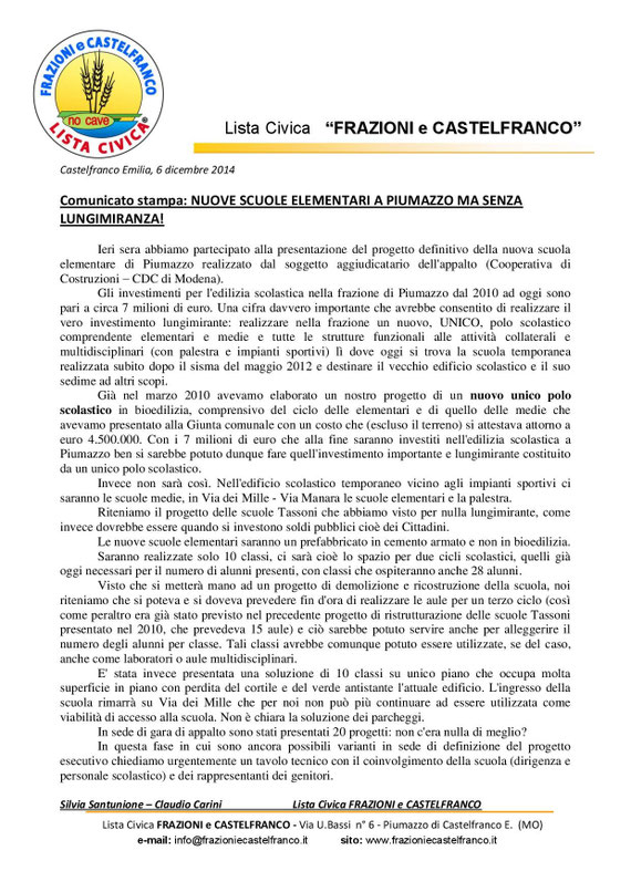 08. dicembre 2014 Comunicato stampa: NUOVE SCUOLE ELEMENTARI A PIUMAZZO MA SENZA LUNGIMIRANZA Comunicato in formato PDF Comunicato stampa scuole Piumazzo_ok.pdf Documento Adobe Acrobat 526.6 KB Download tagPlaceholderTag: Scrivi commento Commenti: 0