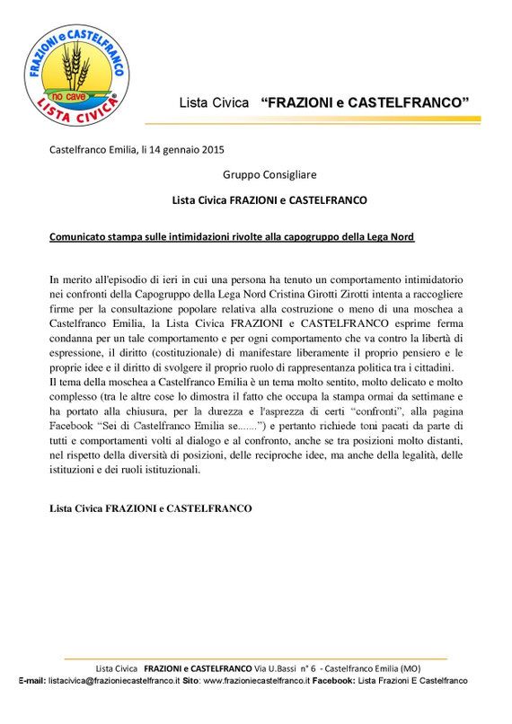 14. gennaio 2015 COMUNICATO STAMPA: SONO STATE RIVOLTE INTIMIDAZIONI AL CAPOGRUPPO DELLA LEGA NORD IN CONSIGLIO COMUNALE tagPlaceholderTag: Scrivi commento Commenti: 0