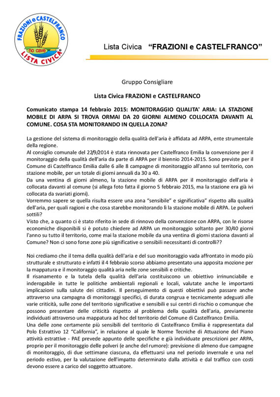 15. febbraio 2015 COMUNICATO STAMPA - MONITORAGGIO QUALITA' ARIA Comunicato in formato PDF Comunicato stampa monitoraggio aria.pdf Documento Adobe Acrobat 343.7 KB Download tagPlaceholderTag: Scrivi commento Commenti: 0
