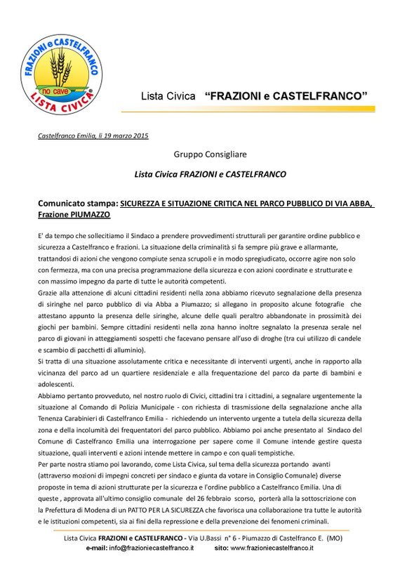 19. marzo 2015 COMUNICATO STAMPA: SIRINGHE IN UN PARCO VICINO AI GIOCHI DEI BAMBINI Comunicato in formato PDF Comunicato stampa parco pubblico Via Abb Documento Adobe Acrobat 1.1 MB Download tagPlaceholderTag: