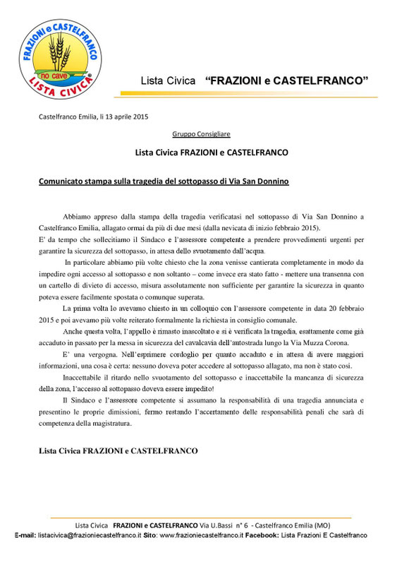 13. aprile 2015 TRAGEDIA NEL SOTTOPASSO DI VIA SAN DONNINO - COMUNICATO STAMPA tagPlaceholderTag: Scrivi commento Commenti: 0