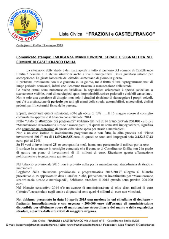24. maggio 2015 COMUNICATO STAMPA - EMERGENZA MANUTENZIONE STRADE E SEGNALETICA Comunicato in formato PDF Comunicato stampa manutenzione strade e Documento Adobe Acrobat 518.8 KB Download tagPlaceholderTag: Scrivi commento Commenti: 0