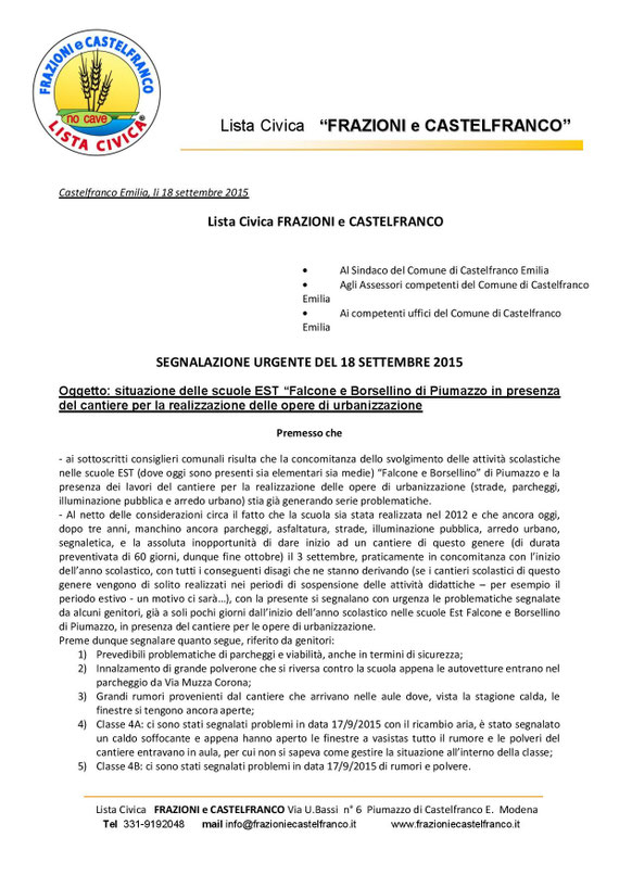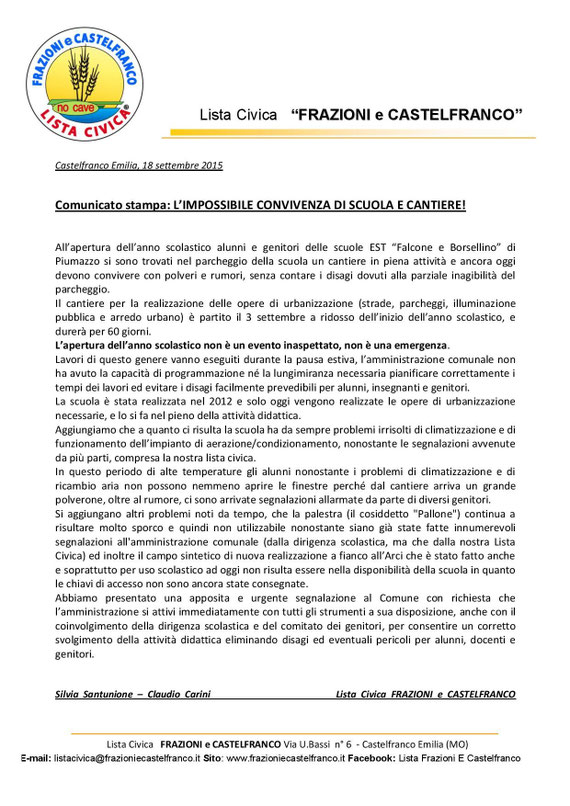 18. settembre 2015 A Piumazzo cantiere aperto nel parcheggio della suola durante le lezioni, Comunicato stampa e segnalazione al sindaco tagPlaceholderTag: Scrivi commento Commenti: 0