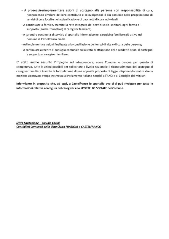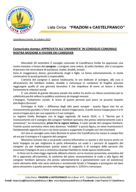 04. ottobre 2015 ABBIAMO PRESENTATO IN CONSIGLIO COMUNALE UNA MOZIONE A FAVORE DEI CAREGIVER, LA MOZIONE E' STATA APPROVATA ALL'UNANIMITA' tagPlaceholderTag: Scrivi commento Commenti: 0