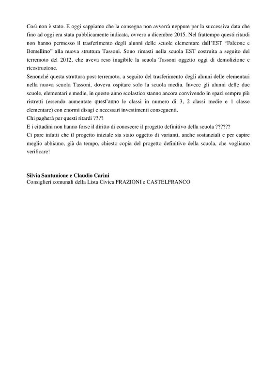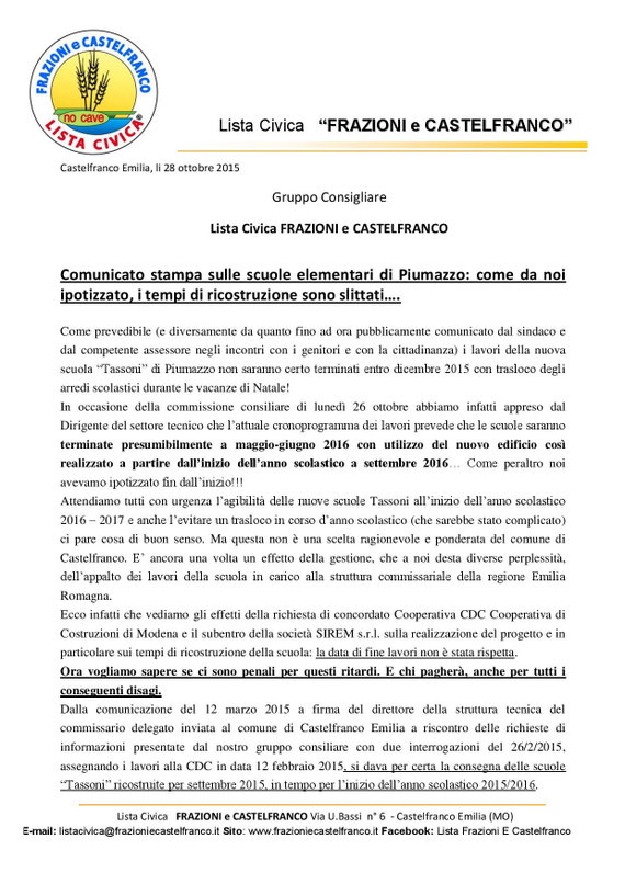 28. ottobre 2015 COMUNICATO STAMPA - LA COSTRUZIONE DELLE SCUOLE TASSONI DI PIUMAZZO NON RISPETTERA' I TEMPI PROMESSI tagPlaceholderTag: Scrivi commento Commenti: 0