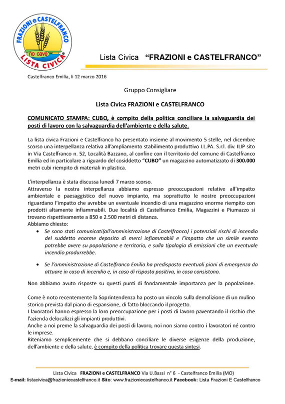 12. marzo 2016 COMUNICATO STAMPA RIGUARDO AL "CUBO" E' COMPITO DELLA POLITICA SALVAGUARDARE SIA LE ESIGENZE DEL LAVORO CHE QUELLE DELL'AMBIENTE E DELLA SALUE Comunicato stampa in formato PDF COMUNICATO STAMPA ILIP-ILPA 12 03 16.pd Documento Adobe Acrobat 602.5 KB Download tagPlaceholderTag: Scrivi commento Commenti: 0