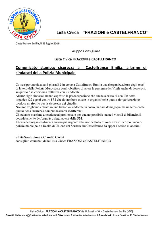 23. luglio 2016 ALLARME SICUREZZA A CASTELFRANCO EMILIA DA PARTE DEI SINDACATI DELLA POLIZIA MUNICIPALE tagPlaceholderTag: Scrivi commento Commenti: 0