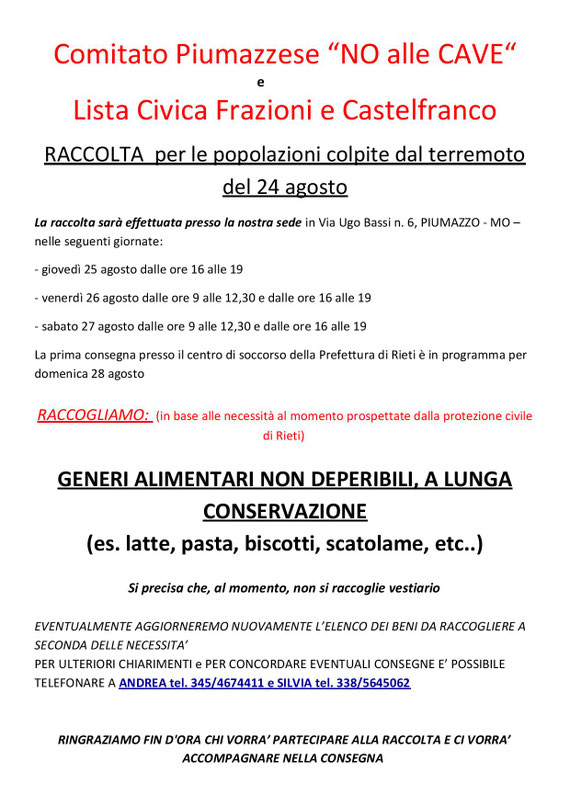 Aggiornamento dell'elenco dei beni che servono: abbiamo contattato come già fatto in precedenza la prefettura di Rieti. I generi alimentari sono per ora sufficienti, mentre occorrono