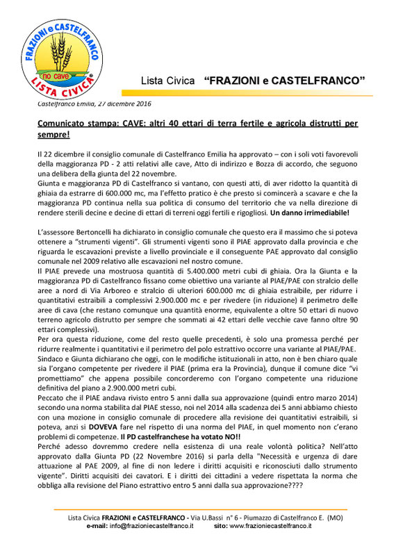 27. dicembre 2016 CAVE - COMUNICATO STAMPA fare click sul titolo per vedere l'articolo completo Comunicato in formato PDF scaricabile Comunicato stampa cave 27 12 16.pdf Documento Adobe Acrobat 438.2 KB Download tagPlaceholderTag: Scrivi commento Commenti: 0