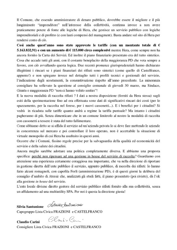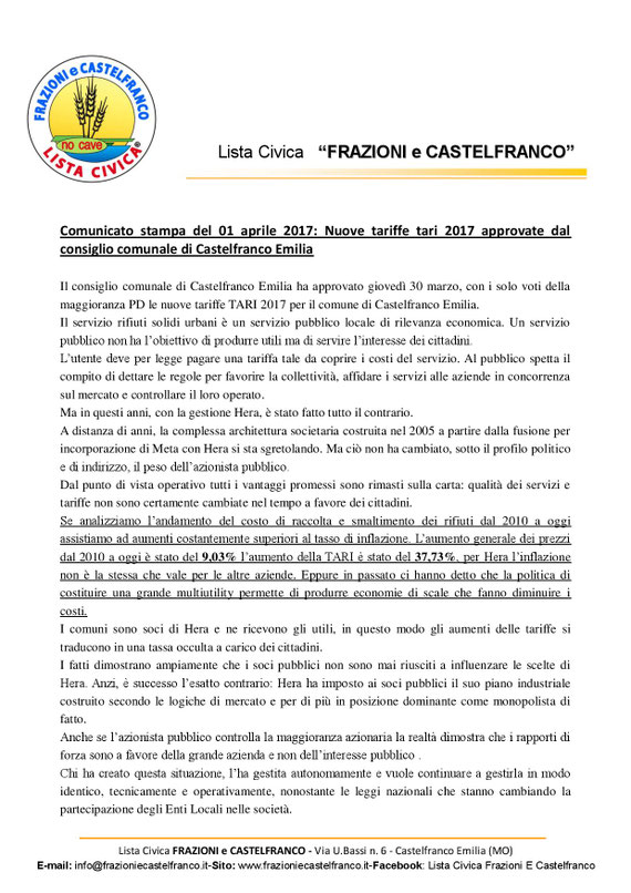 05. aprile 2017 TARIFFE TARI SEMPRE IN AUMENTO - Comunicato stampa Comunicato stampa in formato PDF Comunicato stampa TARI 2017 a Castelfran Documento Adobe Acrobat 386.4 KB Download tagPlaceholderTag: Scrivi commento Commenti: 0