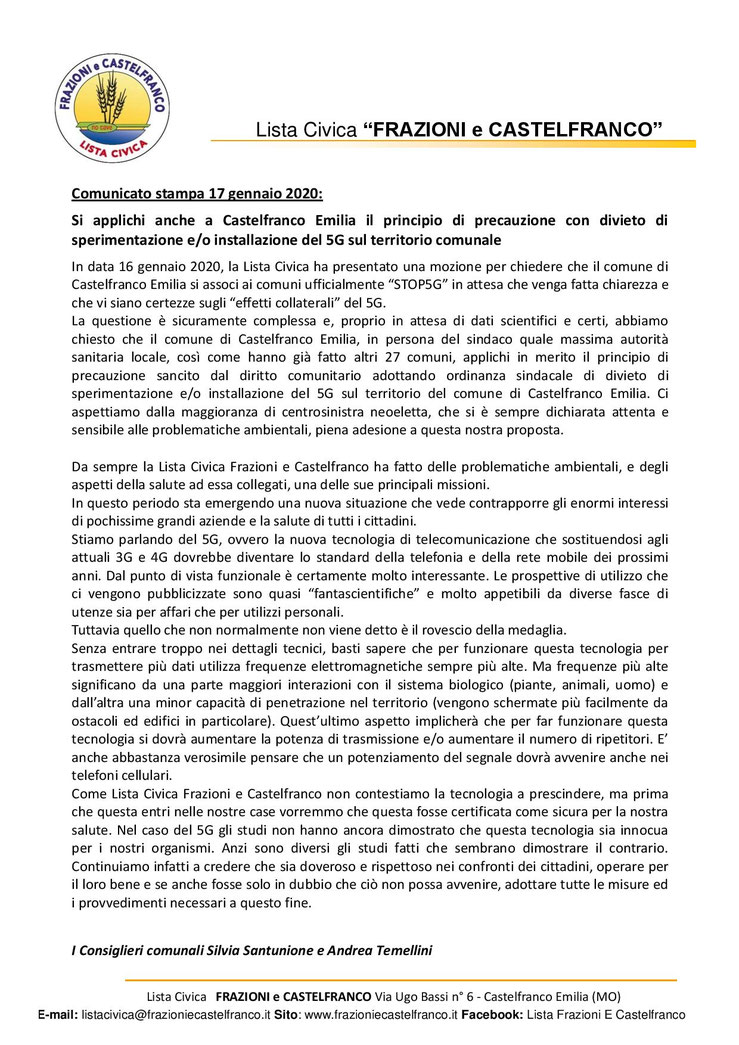 19. gennaio 2020 COMUNICATO STAMPA: NO 5G PRIMA DI CERTEZZE SCIENTIFICHE SULLA SALUTE tagPlaceholderTag: