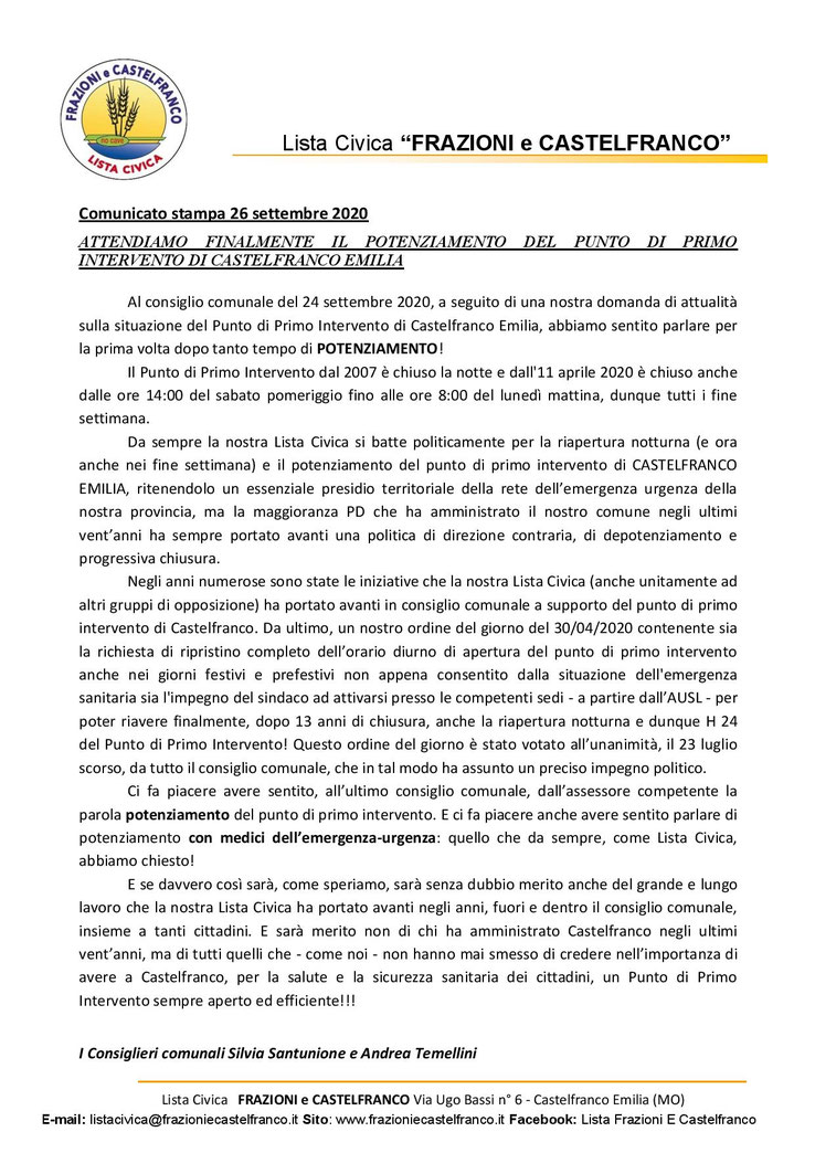 30. settembre 2020 COMUNICATO STAMPA: Potenziamento del punto di primo intervento Puoi scaricare il documento in formato PDF Comunicato stampa potenziamento Punto di Documento Adobe Acrobat 188.4 KB Download tagPlaceholderTag: