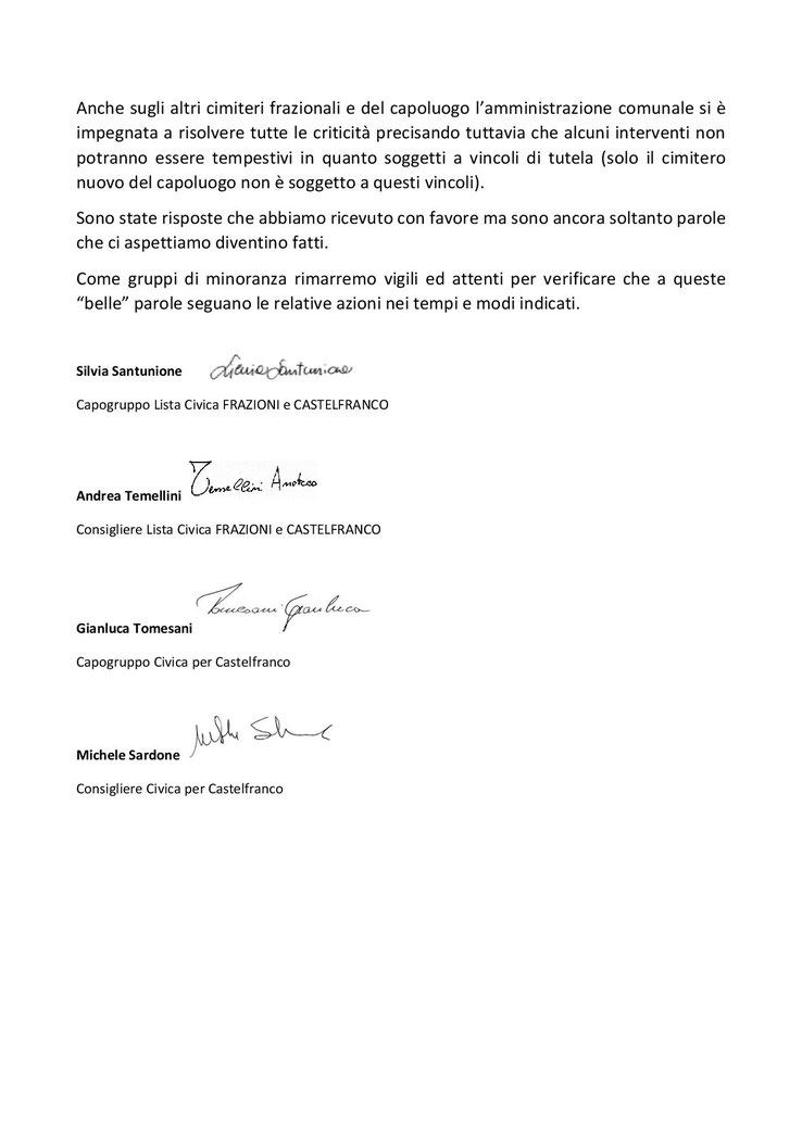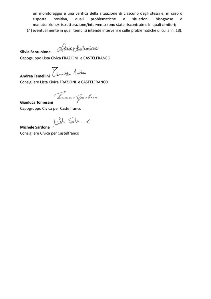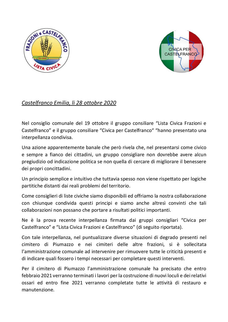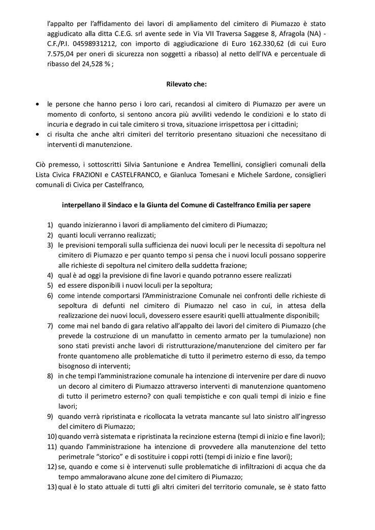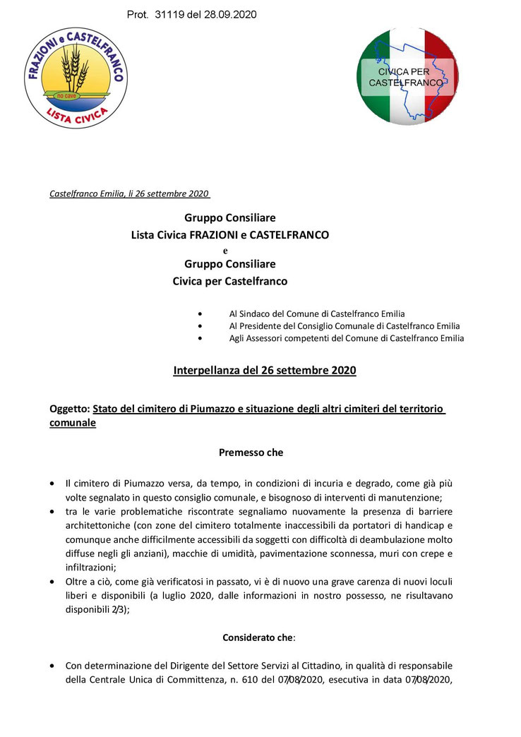 29. ottobre 2020 Comunicato stampa: Una iniziativa in collaborazione con il nuovo gruppo consiliare di fuoriusciti dalla Lega Il testo dell'interpellanza Comunicato stampa in formato PDF ComunicatoCondiviso Cimiteri_20201028.pd Documento Adobe Acrobat 190.0 KB Download Interpellanza in formato PDF Interpellanza_cimiteri.pdf Documento Adobe Acrobat 742.2 KB Download tagPlaceholderTag: